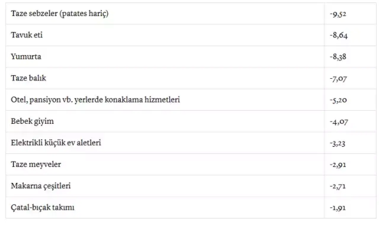 Geçtiğimiz ay taze sebzelerde önemli bir fiyat düşüşü gözlemlendi. Patates hariç tutulduğunda, bu düşüş yüzde 9,52 oranında gerçekleşti. Ardından, tavuk eti fiyatları yüzde 8,64 oranında, yumurta fiyatları ise yüzde 8,38 oranında azaldı. Ayrıca, taze balık fiyatlarındaki gerileme yüzde 7,07 olarak kaydedilirken, otel ve pansiyon gibi konaklama hizmetleri de yüzde 5,2 oranında bir düşüş yaşadı.