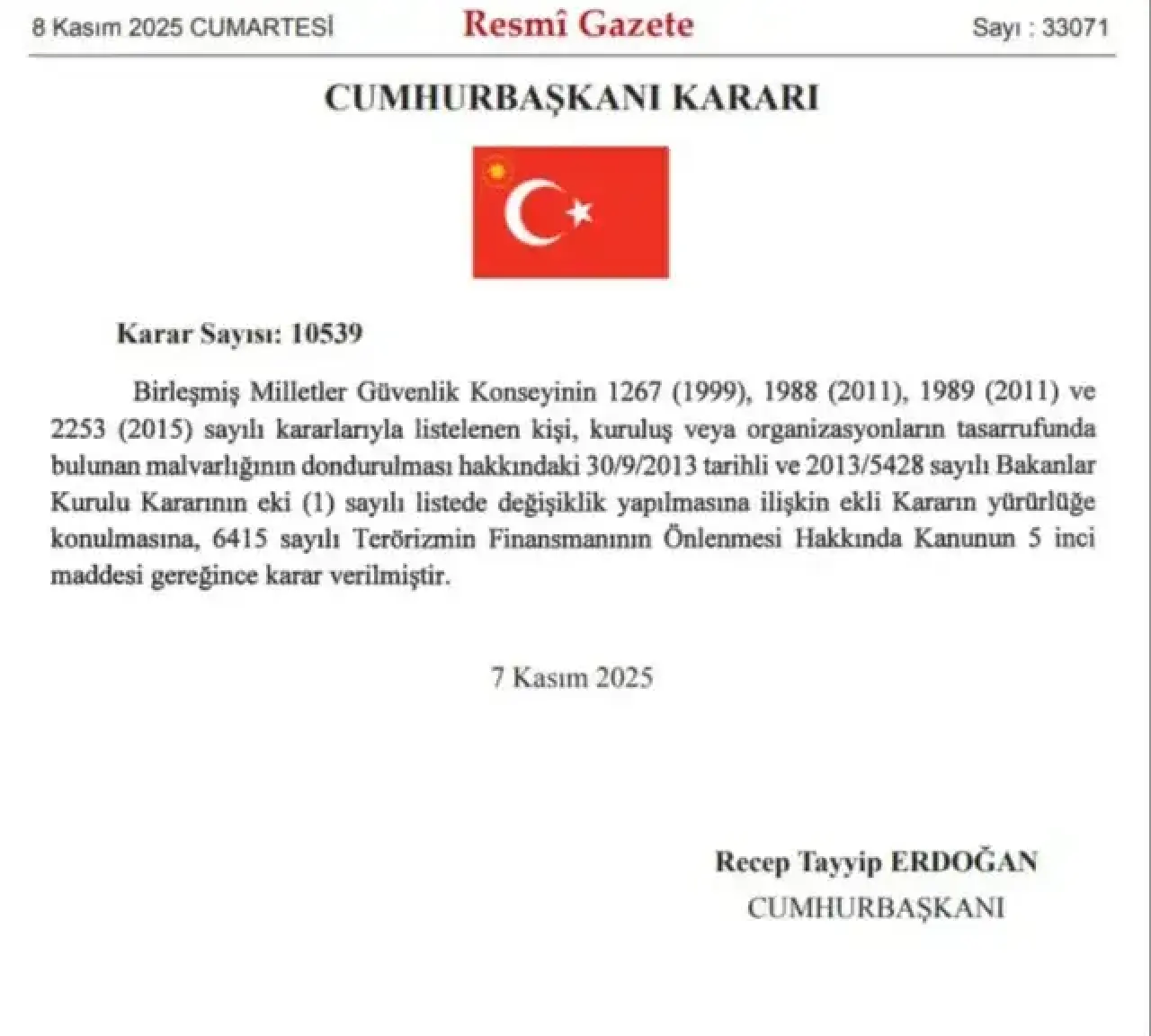 Cumhurbaşkanı Erdoğan'ın imzasıyla yayımlanan bir kararda, DEAŞ ve El Kaide terör örgütleriyle bağlantılı olarak tanımlanan iki şahsın Türkiye üzerindeki mal varlıklarının dondurulması uygulamasının sonlandırıldığı açıklandı. İlgili karar, Türkiye'nin ulusal güvenliğini ve terörle mücadele stratejisini göz önünde bulundurarak alınmıştı. Ancak, yapılan düzenleme ile bu iki kişi üzerindeki mal varlığı dondurma işlemi iptal edildi. Karar, Resmi Gazete'de yayımlanarak yürürlüğe girdi.