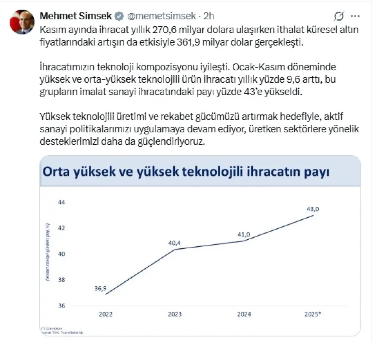 Bakan Şimşek, kasım ayı itibarıyla Türkiye'nin yıllık ihracat rakamının 270,6 milyar dolara ulaştığını açıkladı. Küresel altın fiyatlarındaki artışın ithalat üzerinde etkili olduğunu belirten Şimşek, bu alandaki değerlerin 361,9 milyar dolara yükseldiğini ifade etti. Özellikle ocak-kasım döneminde yüksek ve orta-yüksek teknolojili ürünlerin ihracatında %9,6'lık bir artış yaşandığını vurgulayan Şimşek, bu artışın Türkiye'nin imalat sanayi ihracatı içinde önemli bir yer tuttuğunu belirtti. Türkiye'nin ihracatının, teknoloji bileşeninin güçlenmekte olduğunu dile getiren bakan, bu durumu ülke ekonomisi açısından bir dönüm noktası olarak nitelendirdi.