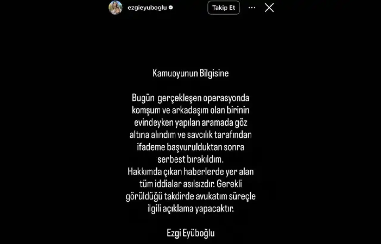 Serbest bırakılmasının ardından Ezgi Eyüboğlu, sosyal medya üzerinden bir açıklama yaparak durumu netleştirdi. Oyuncu, gözaltına alındığı süreçte yaşananları tüm açıklığıyla paylaşarak, hakkındaki iddiaları yalanladı. Eyüboğlu, "Bugün gerçekleşen operasyonda komşum ve arkadaşım olan birinin evindeyken yapılan aramada gözaltına alındım" diyerek başından geçenleri açık bir dille ifade etti. Ayrıca, hakkındaki haberlerde yer alan spekülasyonların asılsız olduğunu belirten oyuncu, sürecin yasal boyutunun da takip edileceğini ve gerekirse avukatı aracılığıyla açıklama yapılacağını ekledi.