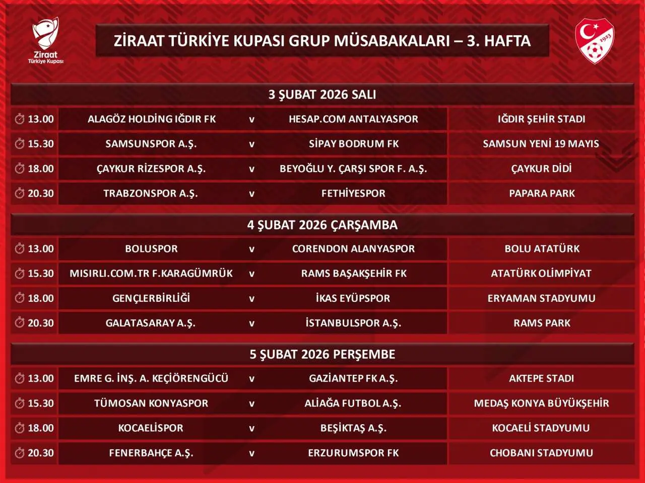 Trabzonspor, Ziraat Türkiye Kupası'nın 3. haftasında oynanacak olan maçların programını duyurdu. Türkiye Futbol Federasyonu, 3 Şubat 2026 tarihindeki karşılaşmaların detaylarını açıkladı.