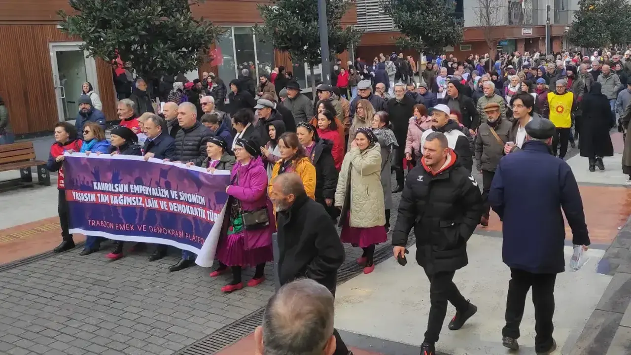 Trabzon'da Emek ve Demokrasi Platformu, ABD ve İsrail'in İran üzerindeki askeri faaliyetlerine karşı bir protesto yürüyüşü düzenledi. Protesto, şehir merkezinde gerçekleştirildi ve katılımcılar, bu ülkelere yönelik sert eleştirilerini dile getirdiler. Yürüyüşün başlangıcı, Maraş Caddesi'nde Postane önünde olurken, sona erdiği nokta ise Meydan Parkı oldu.