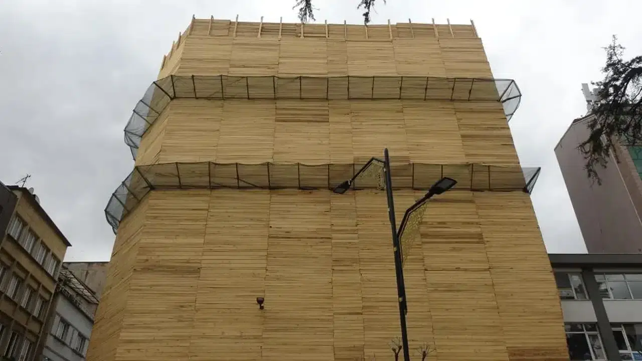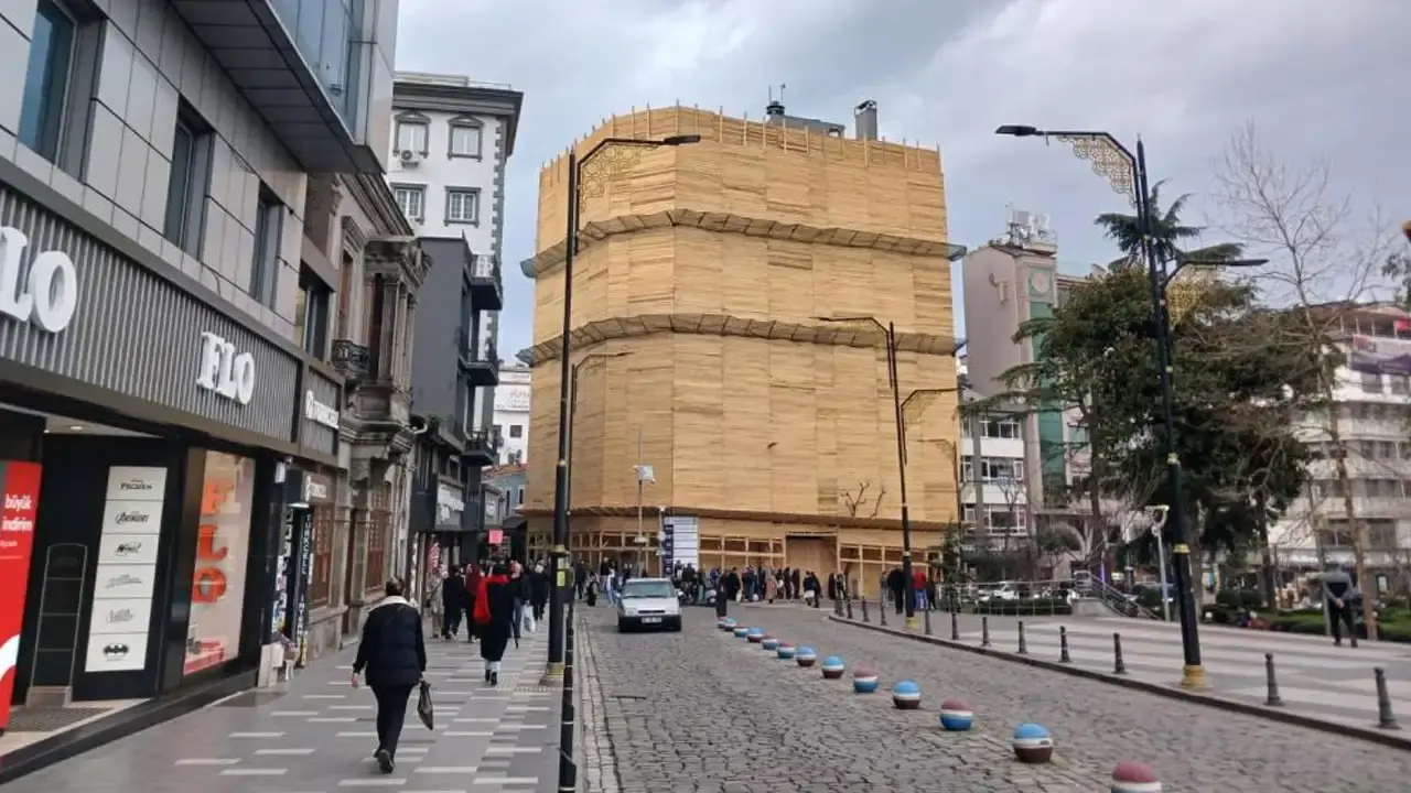Trabzon'un merkezindeki Uzunsokak girişinde yürütülen tadilat çalışmaları, bölgenin görünümünü alışılmadık bir hale getirdi. Ortahisar ilçesinde bulunan bir iş merkezinin dış cephesi, yeni güvenlik önlemleri nedeniyle tamamen kereste ile kaplandı. Bu ilginç uygulama, hem çevredeki sakinlerin hem de geçici olarak bölgede bulunanların dikkatini çekti. Kereste kaplamanın oluşturduğu tuhaf görüntü, adeta dev bir paketin varlığı hissini yaratıyor.